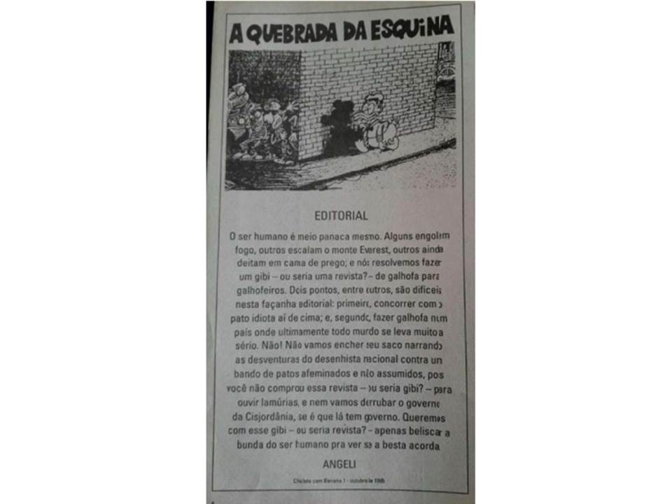 É nesse processo de transição que surge a revista Chiclete com Banana, criada por Arnaldo Angeli Filho[1], em parceria com Toninho Mendes em outubro de 1985, e que expressa em seu conteúdo uma nova forma de conceber a “função” do humor, repensando tanto a concepção de crítica política, como a importância dessa crítica para o contexto contemporâneo. Bastante ilustrativo dessa reflexão é o depoimento de Angeli, dado em uma entrevista concedida à revista Playboy: