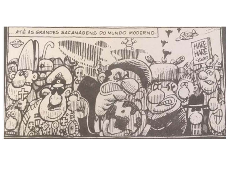 Contracondutas compreendem, pois, “formas de resistência ao poder como conduta” e que buscam “escapar da conduta dos outros (...) definir para cada um a maneira de se conduzir” (FOUCAULT, 2008, p. 257). Essa noção parece pertinente para abordar a primeira aparição de Bob Cuspe, que foi anunciada pelo autor como uma possibilidade política contrária à multidão de personagens – com suas respectivas ideologias – que aparecem no quadro: Pinochet, hare krishnas, o Papa, Ronald Reagan em postura de disputa abraçado ao globo, judeus, dentre outras figuras da época.