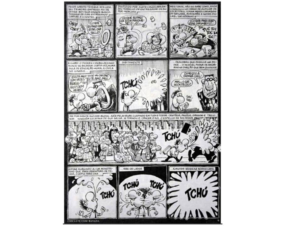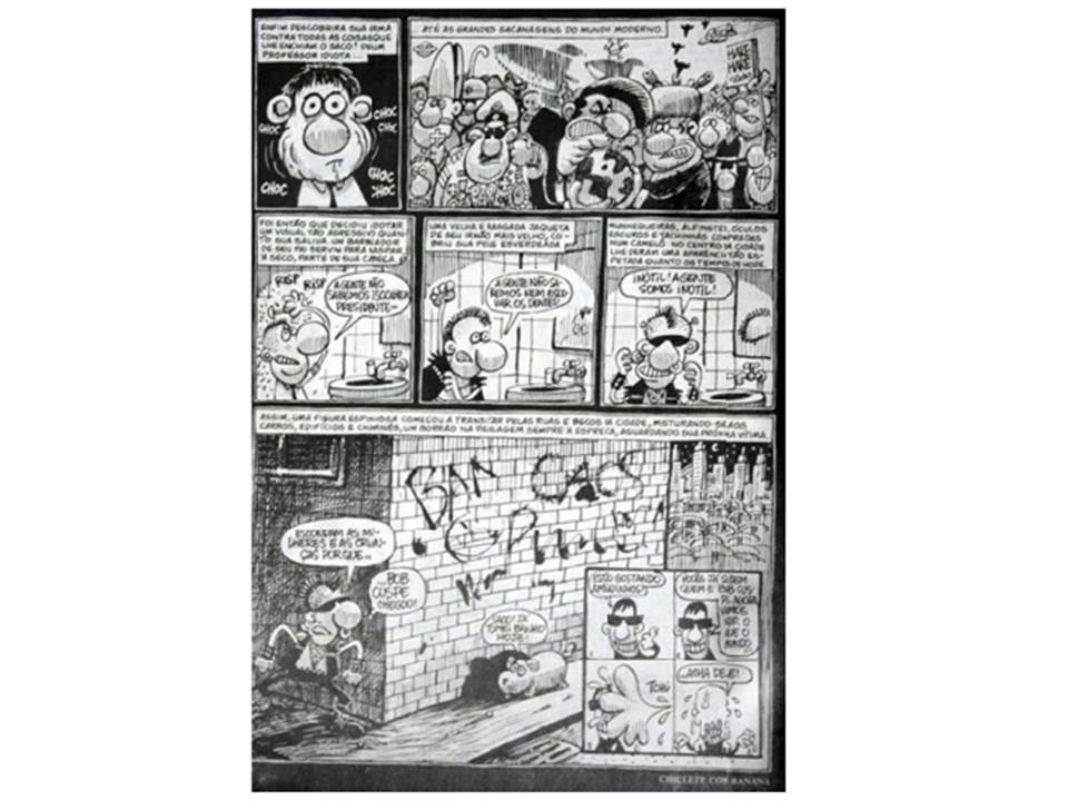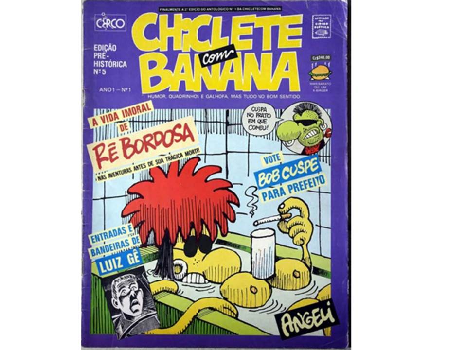Para desenvolver minha premissa, irei apresentar de forma resumida a revista Chiclete com Banana para, em seguida, me dedicar à análise do universo discursivo e comportamental do personagem Bob Cuspe, cujas histórias o tornaram uma das melhores representações dos undergroundscomix. Junto com a personagem Rê Bordosa, Bob Cuspe tornou-se fundamental para dar visualidade aos códigos comportamentais e às linguagens específicas dos circuitos alternativos característicos dos anos 80.