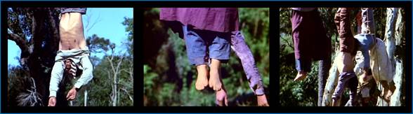 O plano seguinte mostra o corpo do caboclo pendurado de ponta cabeça, ao mesmo tempo em que inicia um som percussivo. Outros planos curtos fornecem vistas de corpos de homens e mulheres que pendem de uma árvore, mortos, enquanto uma voz chorosa inicia um canto, cujo ritmo é marcado pela percussão irregular que pontua a composição musical feita por Sergio Ricardo para esta cena do filme: