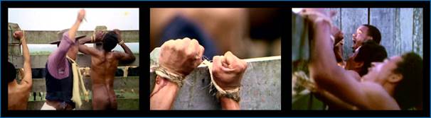 Essa cena dos corpos na árvore, já no prólogo do filme, aparece como violência “disciplinadora”, por assim dizer, que se justificaria do ponto de vista do poder oficial preocupado em garantir a ordem e o progresso no local. Num momento mais avançado do filme, outra cena de violência com função de exemplaridade é a do espancamento dos caboclos. É a mais intensa representação de violência dentro do filme. Não por acaso, foi cortada pela censura da ditadura Médici. Sylvio Back (2008, p. 112-113) conta que: