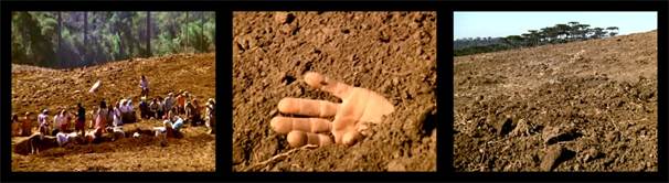 Após a representação da atrocidade, um silêncio se instala. Por longos instantes, em dois ou três planos, a câmera apenas focaliza a terra, que pulsa em ritmo de respiração. O acontecido termina em alegoria. Os mortos estão latentes sob a terra que “lhes foi concedida”.