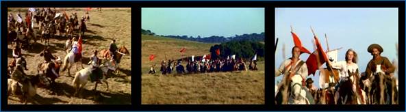O piquete sai em cavalgada, e embalado pela música de Sérgio Ricardo atravessa os campos pontilhados de pinheirais. Alguns homens vão armados com espadas de pau ou com rifles e outros carregam bandeiras santas. Empunhando um estandarte vermelho, Ana vai à frente, ao lado de Adeodato, agora atuando enquanto emblema da liberdade. O cineasta demora-se na representação plástica dessa tomada de atitude. Ao som do violão e da flauta os revolucionários galopam. A soma de braços erguidos empunhando armas, bandeiras vermelhas e brancas tremeluzentes e o balanço das crinas dos cavalos que galopam, traduz visualmente a animosidade do grupo.