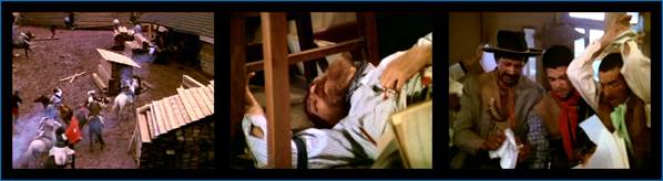 Os pelados remexem nas gavetas e mesas, até encontrar os títulos das terras. Aí, vibram e gritam: “– Chega de pobreza! A terra é nossa!”, ao mesmo tempo em que rasgam e pisoteiam os papéis, chutam os rolos de arame farpado que representam a imposição dos limites territoriais favoráveis à Lumber. À saída, ateiam fogo ao local. Por fim, a câmera focaliza as patas dos cavalos, que pisoteiam a placa com o letreiro da Lumber, agora caída ao chão, quebrada e misturada à lama.
