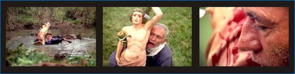 A princípio, a câmera, “escondida” entre as árvores, observa o velho embrenhar-se cada vez mais na mata, e por um tempo o silêncio absoluto cria tensão. Os tiros recomeçam, insistentes, enquanto Pai Velho atravessa um riacho. Após andar algum tempo, ele chama por Adeodato e Ana. Vindo dos arbustos, ouve algo como uma resposta, um “e-ei!” Pergunta: “– ...vocês estão aí?”. A câmera assume o ponto de vista de Pai Velho, aterrorizado. Ela perscruta os arbustos, em travellings laterais, e depois indo adiante, como se fosse o andar do próprio personagem no mato. Os chamados continuam, “e-ei!”, “e-ei!”... A cada vez, a câmera (ocupando o lugar de Pai Velho) se vira na direção do som, movimentos nervosos para um lado, para outro, focando em alguns pontos da vegetação para tentar distinguir quem está ali.