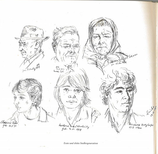 Os rostos dos mais velhos, segundo os autores, carregariam os “vestígios de uma luta pela sobrevivência”, por terem vivenciado duas guerras mundiais, vivido em diferentes Estados, sofrido a perda da pátria, alimentado a esperança da emigração e da fundação de uma nova pátria e, finalmente, resistido aos desgastes da colonização em Entre Rios. Na página anterior, esboços de rostos de pessoas da primeira geração, ainda vivas (entre elas, os pais do presidente da cooperativa Agrária), e da terceira geração, desenhados pelo artista coautor do livro, representam, também visualmente, a continuidade do “destino de colonizador” associado a este grupo e os desafios daí advindos (Vide Figura 1).