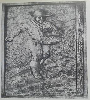 Como podemos visualizar, na parte superior do logotipo da cerveja Donau Bier se reproduz a parte de cima do brasão dos Suábios do Danúbio (fig. 3).[24] A imagem de uma águia negra, num fundo amarelo, simboliza o domínio do imperador da Áustria. Esta imagem é separada da parte inferior do logotipo por uma linha ondulada azul, que representa o rio Danúbio, por meio do qual os suábios chegaram ao sudeste europeu. Na parte central, lê-se o nome da cerveja em letras góticas, marcando assim, não apenas pela denominação, mas também pela grafia, um pertencimento cultural. Na parte inferior, ao invés de reproduzir a parte de baixo daquele brasão, que faz menção ao passado vivido no Sudeste europeu, vê-se a imagem de um agricultor semeando em meio ao campo, ladeada por dois ramos de cereal – base para a produção cervejeira –, simbolizando a “vocação” agrícola dos moradores de Entre Rios. Vale registrar que no distrito de Entre Rios se encontra a maior maltaria do Brasil.[25] A imagem do agricultor, presente no logotipo da cerveja, por sua vez, é uma reprodução de imagem esculpida em placa de madeira pelo artesão tirolês Gottfried Thaler, da colônia austríaca de Treze Tílias – SC, intitulada “O Semeador” (fig. 4).[26] Esta imagem, por sua vez, também é uma releitura de imagem já existente, intitulada “Der Sämann” (O semeador), que circulava em publicações sobre os suábios do Danúbio na Europa, simbolizando “a vida campesina dos colonizadores”.[27]