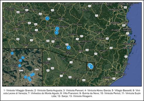 Como no presente artigo não estamos discutindo as razões da formação de associações e, sim, estamos voltados às vinícolas que se enquadram no padrão dos “vinhos de altitude”, faremos uma rápida análise dos aspectos que consideramos importantes para conhecimento dos leitores e para a nossa pesquisa. Na Figura 3, temos a localização das vinícolas que estão sendo analisadas e suas respectivas localizações.