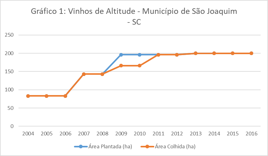 Na análise de dados coletados, ficou evidente que, apesar da importância dos municípios como Campo Belo do Sul, Videira, Água Doce e Tangará, a maior concentração de vinícolas de Vinhos de Altitude se concentra em São Joaquim, com a maior área plantada com uvas viníferas em Santa Catarina. Os dados da sua produção podem ser observados no Gráfico 1. Em 2004, houve as primeiras colheitas nas vinícolas que já estavam estabelecidas e os dados se mantiverem estáveis até 2006. A partir de 2007, temos um crescimento das áreas plantadas, mas o maior incremento acontece em 2009: de 143 hectares plantados, passam a 196 hectares. Esse numero permanece estável até o ano de 2013, quando tem um pequeno acréscimo.