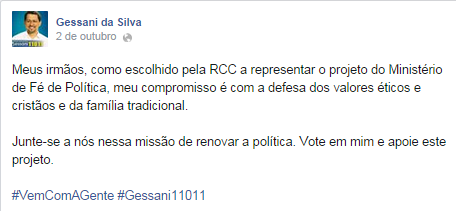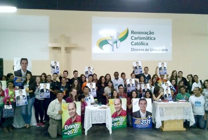 Vinculados à Igreja Católica, foram identificados quatro candidatos que fizeram uso intenso dos elementos religiosos como estratégia de campanha. Três deles – Evandro Araújo (PSC), Jura (PSD) e Gessani (PP) – receberam o apoio explícito do Ministério Fé e Política, vinculado à Renovação Carismática Católica (MFP/RCC), cuja estrutura e funcionamento no Paraná adota certas especificidades. Enquanto em nível nacional tal ministério visa uma formação política em sentido amplo, sem a intenção assumida de atuar em campanhas eleitorais, no Estado do Paraná sua atuação parece ser mais diretiva, tendo em vista a ação explícita de indicação de candidatos nas eleições para Deputado Estadual e Federal em 2014, e a busca de apoios de eleitores nas diferentes paróquias do estado (RCC/Brasil, 2016; RCC/PR, 2013).