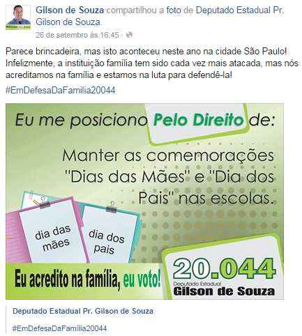 Gilson de Souza (PSC) foi líder da 43ª Igreja do Evangelho Quadrangular (IEQ) de Curitiba e, em 2014, concorreu para seu segundo mandato na ALEP, tendo sido eleito com apoio oficial da Igreja do Evangelho Quadrangular. Sua campanha foi bastante robusta, com uma participação ativa da instituição religiosa, envolvendo reuniões com pastores de diversas localidades do estado, além de constantes mensagens de apoio divulgadas nas redes sociais. Além disso, em diversos momentos, participou de reuniões contando com a presença de lideranças de seu partido, como Pastor Everaldo – que concorria à época para a Presidência da República –, Takayama – candidato a Deputado Federal – e Ratinho Junior – que também disputou uma vaga junto à ALEP. Em diversos materiais de campanha, Gilson de Souza assumia como pauta a defesa da família e o direito de manifestação contra o que seriam práticas imorais e/ou anticristãs, dentre as quais estariam as propostas de descriminalização do aborto e das drogas, e a criminalização da homofobia. Outro destaque de sua campanha é que, em seu primeiro mandato na ALEP, buscou realizar homenagens, destinar emendas parlamentares e criar leis que favoreciam diretamente os evangélicos, em especial a Igreja do Evangelho Quadrangular. Gilson de Souza foi eleito com um total de 34.470 votos, recebidos de eleitores localizados em 333 municípios do Paraná, sendo 34,38% de Curitiba.