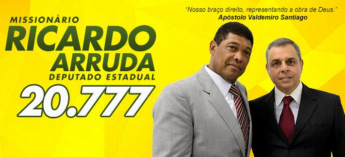 Em sua campanha à ALEP em 2014, Missionário Ricardo Arruda (PSC) contou com apoio maciço do líder máximo da Igreja Mundial do Poder de Deus, o Apóstolo Valdemiro Santiago, que aparece com frequência nos materiais de campanha, sendo seu maior cabo eleitoral. Logo no início da campanha, Ricardo Arruda e sua esposa aparecem em um culto, durante o qual o Apóstolo consagra o casal, em ato que simboliza a unção de seus soldados para a política. Analisando as falas de Valdemiro, fica evidente o esforço de anunciar o candidato como um legítimo representante da obra de Deus, “homem de Deus” e “defensor do evangelho”. Nesse movimento, utiliza-se do discurso para mobilizar os telespectadores a atuarem como cabos eleitorais do Missionário Ricardo Arruda, pedindo votos inclusive aos católicos. Sua campanha contou com visitas a igrejas em diferentes municípios do estado, evidenciando uma rede de apoio por partes dos pastores vinculados à instituição religiosa. Ainda durante a campanha, nos dias que antecederam a eleição, Ricardo Arruda divulga a visita do então Governador Beto Richa à Igreja Mundial em Curitiba. Missionário Ricardo Arruda foi eleito com 23.592 votos, distribuídos em 386 municípios do Estado do Paraná, estando concentrados em Curitiba 18,79% de seus eleitores.