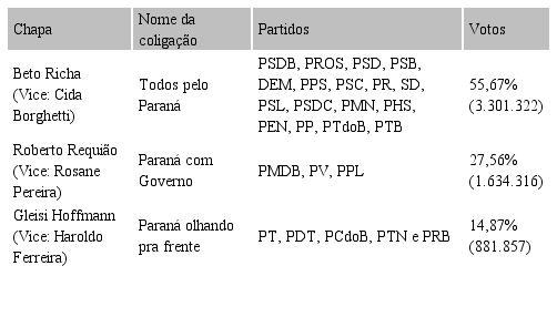 Fonte: TSE, 2014.Na disputa, a coligação “Todos pelo Paraná” obteve êxito na reeleição de Beto Richa ainda no primeiro turno, conquistando 55,67% dos votos e compondo a maioria das 54 vagas da Assembleia Legislativa do Paraná (ALEP).