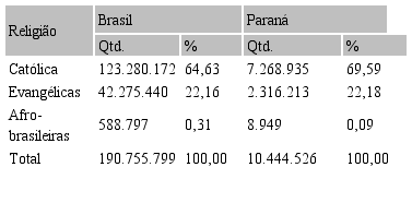 Em vista de analisar as candidaturas de agentes religiosos à ALEP, uma das variantes que deve ser considerada é o pertencimento religioso da população paranaense. Observando a distribuição da população brasileira (Tabela 2), verificamos que a maioria se declara católica (64,63%), seguida dos evangélicos (22,16%), sendo que as religiões de matriz afro-brasileira representam 0,31%. Já no Paraná, identificamos que o percentual de evangélicos é bastante semelhante ao perfil nacional, embora haja uma maior concentração de católicos (69,59%) e uma representatividade significativamente menor de adeptos às religiões de matriz afro-brasileira (0,09%).