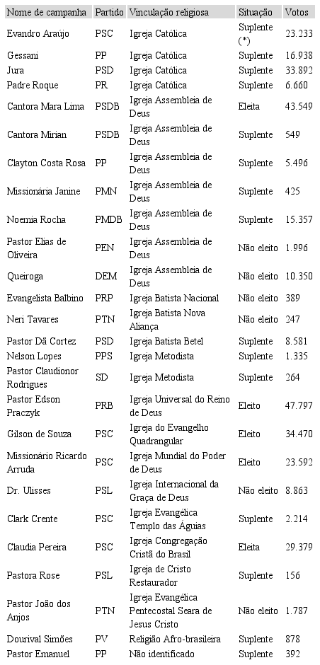 Fonte: Dados da pesquisa.No intuito de compreendermos os acionamentos dos elementos religiosos no tempo da eleição, e, ainda, em que medida os candidatos apresentam-se como porta-vozes escolhidos por sua instituição religiosa, apresentamos de modo mais aprofundado as campanhas dos 16 agentes religiosos mencionados, organizando-os pela religião de vinculação.