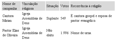 Fonte: Dados da pesquisa.Candidatos à ALEP em 2014 que recorreram pontualmente a elementos religiosos durante a campanha eleitoral