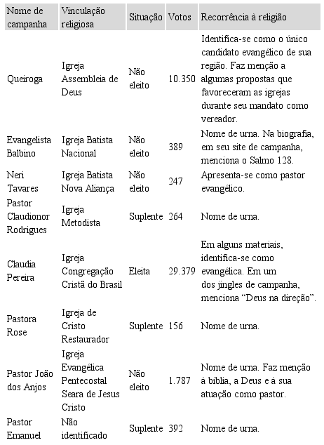 Como um primeiro movimento, é válido mencionar que os candidatos fazem uso de elementos religiosos em intensidades e frequências diferenciadas. Assim, dentre os 26 nomes da Tabela 3, podemos identificar um grupo de dez candidatos cuja recorrência aos elementos religiosos é feita pontualmente, em menor intensidade (Tabela 4). Nesses casos, que se referem tanto a campanhas menos expressivas quanto a outras de maior envergadura, tal recorrência se limita ao uso de termos como Pastor ou Evangelista no nome de urna, à menção a Deus ou a passagens bíblicas de modo esporádico nos jingles e demais materiais de campanha, ou ainda na apresentação do candidato como religioso – no caso, evangélico – sem que tais referências apareçam como norteadoras de sua campanha, de sua identidade política ou de suas propostas, e tampouco que sua candidatura seja assumida por alguma instituição ou grupo religioso.
