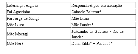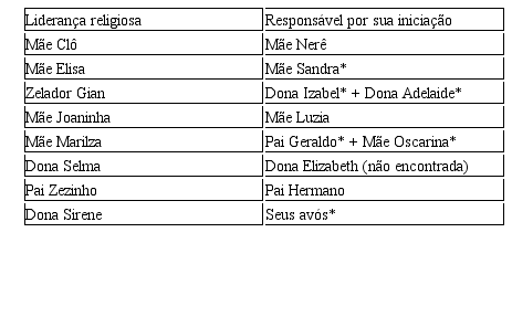 Para cada grupo também foi produzida uma tabela com os responsáveis pela iniciação religiosa de determinada liderança. Noto que, nos casos em que não pude colher tal informação, o nome do sacerdote não aparece na tabela. As lideranças religiosas nascidas no município, ou para cá vindas na primeira infância, em sua maioria, tiveram seus ritos iniciáticos realizados na região de Maringá, como demonstra a Tabela 2: