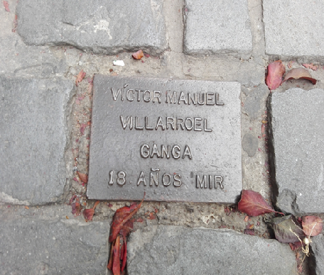 Fonte: Produção da autora, 2017.Na rua tortuosa, no número 38, alguém escreveu na parede: «Aqui hubo muerte!» e, na elegante porta de madeira «Aquí torturarán a mi hijo». No chão, entre as folhas secas do Outono, a calçada de paralelepípedos de rocha vulcânica tem alguns destes substituídos por placas de metal, com os nomes dos que ali desapareceram, alvos de uma violência que não deixou rasto, corpo, testemunho de terceiros, provas jurídicas (LEFRANC, 2002). Uma placa maior elucida que o local se tornou monumento (Figura 2).
