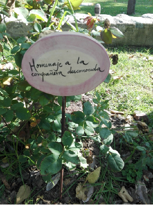 Fonte: Foto da autora, 2017À nossa frente, a piscina abandonada tem águas das chuvas e folhas mortas – e um passado de memória promíscua, perversa, entre o trivial, o convivial e o horror. Perto, há um roseiral, o «Memorial Jardín de las Rosas»: em três círculos, em torno de um lago, lembra-se as 36 mulheres que morreram na Villa Grimaldi, no segundo, as 102 chilenas que foram mortas na década de 1970, e no terceiro, as 53 que foram assassinadas na década de 1980 (Figura 6). Entre as rosas, pequenas placas assinalam o nome das mulheres mortas ou desaparecidas. Uma delas lembra a «companheira desconhecida».