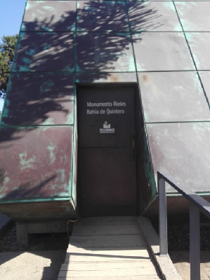 Do lado direito, a partir da entrada, um monumento lembra os carris encontrados na Baía de Quintero, aqueles a que eram atados os presos, depois de injetados com substâncias que os adormeciam ou matavam, e que eram lançados dentro de sacos, a partir de helicópteros, nos mares do Chile (Figura 8). Esses carris, encontrados em quantidade na referida baía, foram trazidos para este espaço, e instalados num cubo metálico semi-enterrado. No caso de Marta Ugarta, o corpo ter-se-á soltado das barras de ferro. O botão de nácar a que se refere o filme de Patricio Guzmán está preso num dos carris aqui depositados, sinal indelével das atrocidades cometidas.