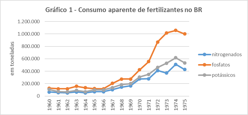Nos países capitalistas periféricos houve ampla recepção dos paradigmas da modernização da agricultura, desvelando suas reais intenções: “a maximização do lucro, através da monopolização de fatias cada vez maiores do mercado; e a aquisição de royalty, por intermédio dos pacotes tecnológicos” (ANDRADES; GANIMI, 2007, p. 44). Segundo Virgínia Fontes (2010, p. 184), nestes territórios, a Revolução Verde foi projetada ainda para “[...] borrar da história as revoluções vermelhas” com foco na potencialização da produção de culturas de exportação. Para tanto, tinha como alicerces a expropriação dos povos do campo e o uso de maquinário, além da relação intrínseca de dependência entre água e insumos químicos, cujo consumo através de produção interna, e principalmente através de importações, aumentou sensivelmente, conforme podemos visualizar no Gráfico 1: