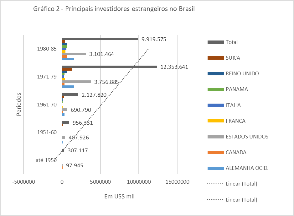 Somado aos fundos públicos, os Investimentos Diretos Estrangeiros (IED) resultaram em importantes fontes de financiamento e garantias para órgãos e empresas no Brasil. A comitiva brasileira muito provavelmente tinha ciência que a entrada de capitais estrangeiros nos anos 1950 havia sido elevada, com destaque para a atuação de instituições europeias e estadunidenses (MOLINA, 2016). O volume de investimentos e reinvestimentos não apenas foi garantido, como continuou e foi ampliado nas décadas seguintes, inclusive com incentivo das autoridades monetárias brasileiras. A seguir, destacamos as oito principais origens de investimentos e reinvestimentos até 1985 de empresas dos EUA (18,1%), Alemanha (8%), Suíça (4,7%), Reino Unido (3,3%), Canadá (2,9%), Panamá (2,7%), Itália (2,2%) e França (2,1%), conforme exposto no Gráfico 2: