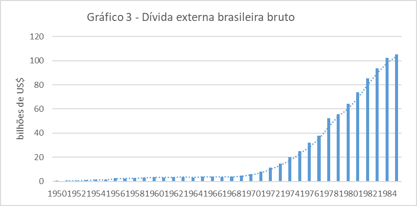 Além da ampliação destes IED, os anos 1960-70 foram marcados por reformas institucionais no sistema financeiro com elevada expansão da dívida externa, conforme podemos observar no Gráfico 3. Isto se deu através da atuação do Estado enquanto devedor-credor e como estimulador de setores que considerava estratégicos (infraestrutura e tecnologia), submetendo outras áreas que dependiam fortemente de subsídios (exportador e agrícola). Ademais, a partir dos anos 60, as grandes empresas estatais passaram a realizar pedidos de empréstimos diretos, principalmente ao BM/BID, seguindo uma tendência de aprofundamento do endividamento brasileiro nos anos 1970 em relação a outros bancos (ABREU et al., 1995).