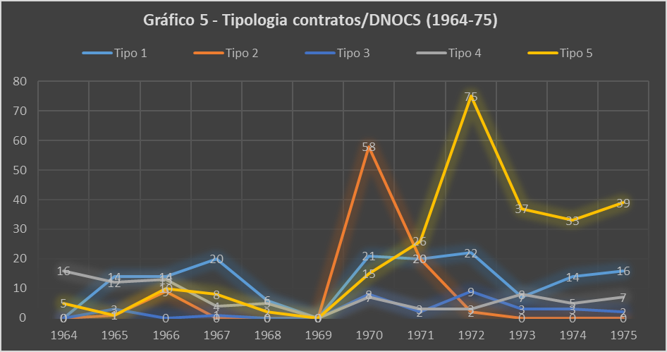 Todos estes aspectos compuseram os contratos de tipo 5. E são eles que dão volume à tendência altista da linha amarela no Gráfico 5 a partir de 1970, com topo no ano de 1975, seguida por uma correção e constância no número de contratações nos anos de 1973, 1974 e 1975, em confluência com os alvos expressos no PIN e no PPI. A movimentação da linha amarela neste gráfico representa, na realidade, a multiplicação de ações voltadas para a consecução do objetivo de modernização agrícola no Nordeste através da criação de vários perímetros ou distritos de irrigação.