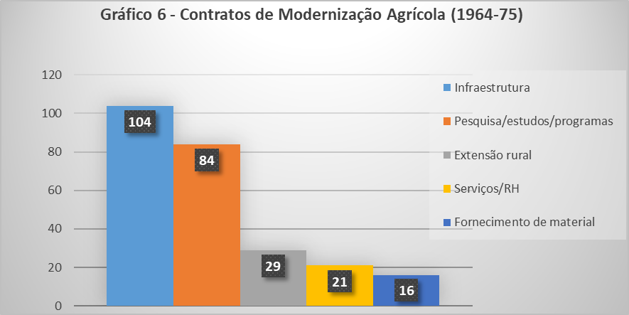 O Estado autoritário e seus agentes compuseram um conjunto variado de políticas públicas, programas e projetos voltados para a transformação do mundo rural (BURSZTYN, 2008). Mereceu atenção o crédito rural (Sistema Nacional de Crédito Rural-1965) e toda a cadeia de atividades envolvidas nas formas de produção modernas voltadas para a agricultura capitalista, como a extensão rural (MENDONÇA, 2010). Para termos uma ideia da sua importância na agenda político-econômica do país, a participação do Tesouro Nacional nos financiamentos do setor agropecuário só iria sofrer retração na segunda metade da década de 1980 (RAMOS; MARTHA JÚNIOR, 2010).