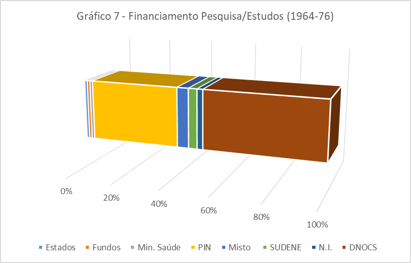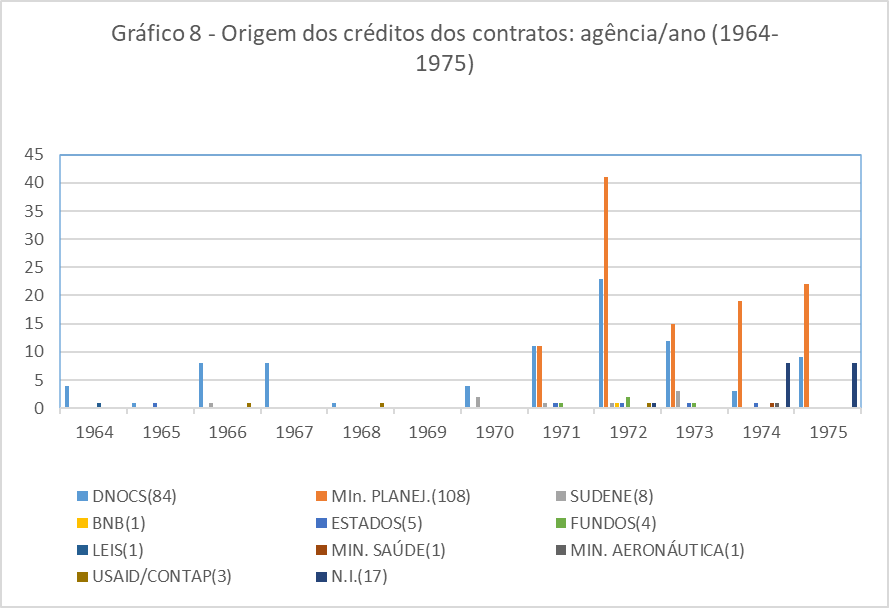O Gráfico 7 demonstra como a maior parte dos valores para cobertura dos estudos e pesquisas provinha principalmente de duas fontes: DNOCS (41 contratos) e PIN (31 contratos). Simultaneamente o DNOCS deslocava somas de seu próprio orçamento, editais, projetos e programas relacionados, a partir de dois ministérios: Ministério do Interior e Ministério de Viação e Obras Públicas. Também operava com títulos da dívida pública como garantia para os contratos. Semelhantemente o PIN era acionado para garantir o financiamento das pesquisas, desvelando o caminho escolhido para o setor agropecuário pelo Governo Federal. Ainda na esfera pública, havia a participação de recursos dos Estados, Fundos, Ministério da Saúde e SUDENE. Eis a arquitetura financeira que viabilizava as transformações registradas nos contratos, mas que dependia ainda de outras engrenagens.