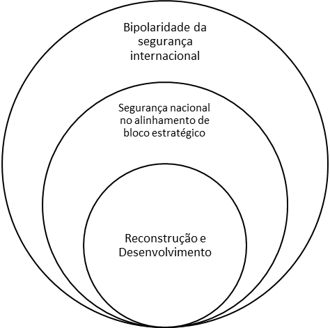 O primeiro cenário refere-se ao momento do pós-segunda guerra mundial até o término da guerra fria (anos 50-90 do século XX), em que a configuração de poder mundial vai tomando forma, tendendo para a bipolaridade. Nesse cenário, a doutrina dos países líderes na polarização estará se afirmando e percebe-se o pressuposto da segurança ativado por uma inquietude de ameaça e de ausência de debates conceituais críticos do campo da segurança de per si, de forma intrínseca. A preocupação com o desenvolvimento e a segurança nacional é influenciada diretamente pelo esforço na equilibração do poder (Figura 1).