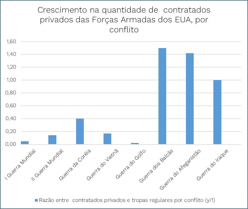 Podemos perceber, ao longo do período da Guerra Fria, o número crescente de contratados privados pelas Forças Armadas dos EUA, e a integração cada vez maior desses contingentes às forças regulares. Conforme podemos observar na figura 1, a proporção de contratados privados em relação às tropas oficiais tem tendência crescente, com a Guerra da Coreia como uma exceção, por conta da enorme quantidade de contratados locais. Uma segunda exceção, a Guerra do Golfo, é o prelúdio de um choque impressionante nas quantidades de funcionários de EMSP que passarão a fazer parte dos contingentes militares norte-americanos a partir da Guerra dos Balcãs.