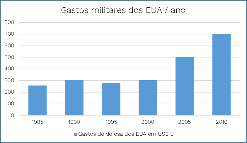 Ao observar os gráficos apresentados na seção anterior, é possível perceber, de fato, a tendência de redução dos contingentes militares a partir do final da Guerra Fria. No entanto, em termos de gastos, uma ruptura importante ocorre entre os anos de 2000 e 2005. Embora os contingentes militares regulares se mantenham estáveis no período, os gastos militares explodem, num movimento de incessante crescimento ao longo da década. Entre o ano de 2000 e 2010, os gastos em defesa dos Estados Unidos aumentaram mais de 130%.