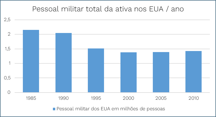Nas duas figuras a seguir (Figura 2 e 3), é possível perceber a tendência de diminuição de gastos militares e de pessoal militar no período do pós-Guerra Fria. Os gastos militares dos Estados Unidos crescem ininterruptamente de 1974 até um pico em 1990 quando atingem aproximadamente US$ 306 bilhões. A partir daí, recuarão até aproximadamente US$ 270 bilhões em 1996. Uma leve tendência de retomada dos gastos ocorre até 2002, quando sofrerão o grande impacto das políticas de segurança traçadas no pós 11 de setembro. Isso significa uma redução de mais de 15% num período de seis anos (SIPRI, 2020).