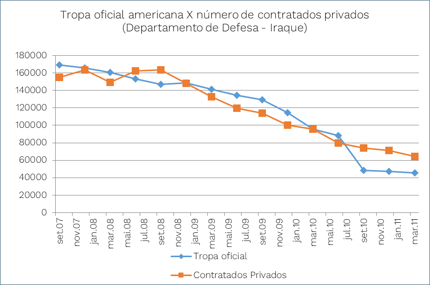 É possível observar, no gráfico a seguir (Figura 4), que no ano de 2010, momento de uma retirada maciça de tropas, os números de terceirizados passam a superar notavelmente a quantidade de forças regulares, chegando a uma razão próxima de 1,5/1. O processo, que se enquadra no modelo de explicações político-instrumentalistas (KRUCK, 2013), leva a crer que o acesso a serviços militares terceirizados permite que o Estado faça uma redução no número de tropas sem que diminua na mesma proporção sua presença militar. Em outras palavras, a retirada de tropas combinada com a permanência de contratados privados permite que se anuncie uma retirada ainda mantendo uma presença relevante. É possível, portanto, que os custos políticos de uma guerra crescentemente impopular[11] possam ter sido reduzidos através da terceirização.