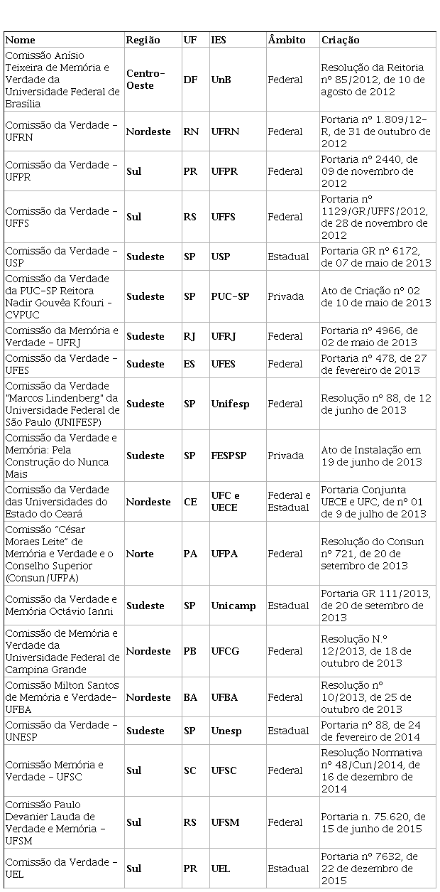 Em 2012 instituiu-se a primeira delas, a Comissão Anísio Teixeira de Memória e Verdade da Universidade Federal de Brasília, instalada no dia 10 de agosto. No ano seguinte, 2013, foram instaladas, em sua maioria, as Comissões da Verdade das instituições paulistas, exceto na Universidade Estadual Júlio de Mesquita Filho, instituída em 2014. A dinâmica de constituição e funcionamento é o objeto central desse artigo, como poderá ser acompanhado ao longo do texto. Para tanto, o artigo foi organizado em quatro seções, além da introdução. A primeira parte apresenta o debate teórico acerca das políticas de memória nos contextos de transição com ênfase nas Políticas de Memória e Comissões da Verdade. A segunda dedica-se ao levantamento e contexto de criação das Comissões da Verdade Universitárias no Brasil.