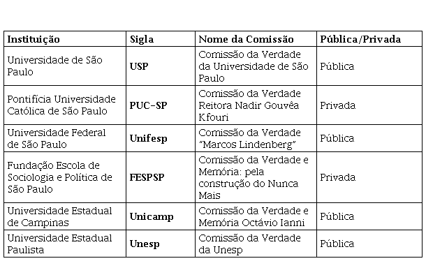 Como indicado anteriormente, a análise refere-se a seis instituições de ensino superior do estado de São Paulo que instalaram Comissões da Verdade, sendo quatro públicas e duas privadas, conforme aponta a tabela a seguir.