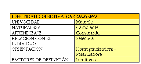 Entendemos la identidad colectiva de consumo como una identidad colectiva existente y múltiple, en tanto que muestra un pasado plagado de intercambios culturales para explicar una supuesta heterogeneidad en el presente. Al basarse en factores intuitivos para su definición, estamos hablando de subjetividades que originan identidades frente a identidad. Cada individuo entenderá la identidad desde su individualidad y desde su posible pertenencia a varios colectivos, pudiendo asumir las características básicas de esa identidad colectiva, pero renunciando a otros aspectos con los que no se identifica o no son de su agrado.