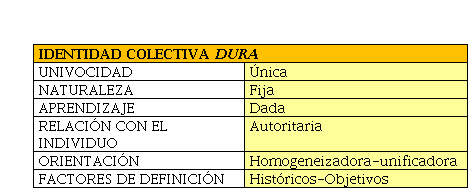 Cuando hablamos de una identidad colectiva dura (RACHIK, 2006) (Tabla 2) estamos hablando de una identidad fundamentada en uno o varios criterios considerados objetivos. Esos elementos culturales objetivos –lengua, religión, costumbres… – vienen dados por la narrativa maestra y aseguran una continuidad social. Habermas (1987 apud MERCADO; HERNÁNDEZ, 2010), en la que llamaba etapa simbólica para la integración de la identidad, hablaba de los valores, las imágenes, los mitos que actúan como elemento cohesionador y como marco normativo. La identidad dura es el resultado de la aplicación de un tipo de enseñanza de la historia –la transmisora– que difiere de la propia del patrimonio-objeto, si bien con elementos de coincidencia. A través del uso del patrimonio-objeto, el discurso histórico elaborado pretende enseñar a los ciudadanos que son libres dentro de un proyecto (más allá de que este tenga, como hemos visto, una dirección definida y un resultado previsto). Por el contrario, la identidad colectiva dura es el fruto de un discurso claro y explícito encaminado a que los valores del pasado tengan una clara proyección en las conductas futuras y no permite interpretaciones múltiples pues tiene la intención clara de definir a un grupo para oponerlo al otro (RACHIK, 2006).