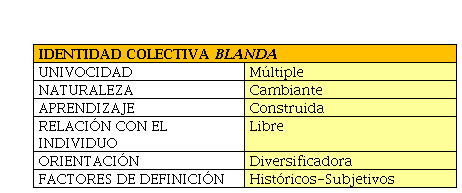 Sin embargo, en ocasiones, una colectividad apoya su idea de grupo en elementos no argumentados histórica o culturalmente. Es decir, existe un grupo que se define como tal porque comparte ciertos elementos no apoyados en razones históricas, y en los que la idea de memoria colectiva también es muy débil, puesto que ni siquiera articula un mensaje coherente y lógico que justifique un presente. Se trata de elementos acumulativos de un pasado sin aparente elemento organizador. Y decimos aparente porque, y como insistiremos, de manera intencionada o no, termina por encontrar un eje vertebrador, muy propio de las sociedades modernas, que intenta conjugar a la vez un aumento de la individualidad al tiempo que mantener la pertenencia a unos esquemas de referencia tradicionales como es el estado-nación.
