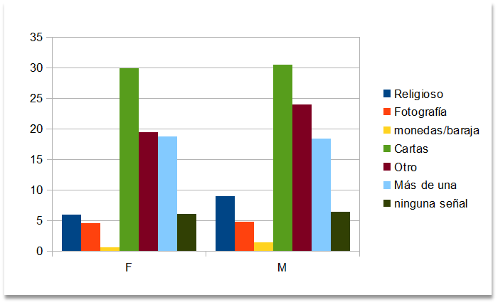 Como se muestra en este gráfico, el tipo de señal más dejado en la infancia del torno eran cartas, donde la familia podía expresar sus emociones, sus sentimientos. Donde expresiones como la culpa y la religiosidad estaban muy presentes y vinculados.