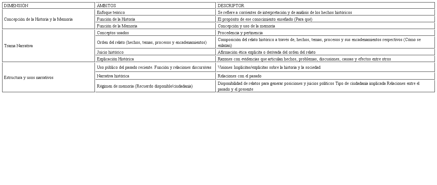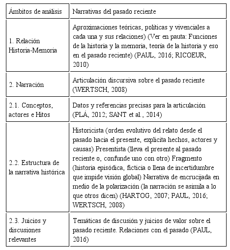 Para el análisis del discurso sobre el recuerdo del pasado reciente en jóvenes se consideraron marcos generales implicados en su elaboración, a saber: narrativas históricas (WERTSCH, 2008) y las relaciones con el pasado mediadas por el pensamiento histórico y sus funciones (PAUL, 2016). Para las configuraciones narrativas especificas se relevaron: la dimensión experiencial de los participantes (CANALES, 2006), las tramas en la que participan las memorias sociales y hegemónicas sobre este pasado (RICOEUR, 2010; RUBIO; OSORIO, 2017; STERN, 2000) y un conjunto de mediaciones ejercidas por la enseñanza de la historia y diversos dispositivos sociales y culturales (ARTEAGA; CAMARGO, 2014; PLÁ, 2012). En base a estas referencias, se organizó una matriz inicial (Matriz 1) compuesta por tres dimensiones y ámbitos que orientaron el guion de los grupos focales.[5]