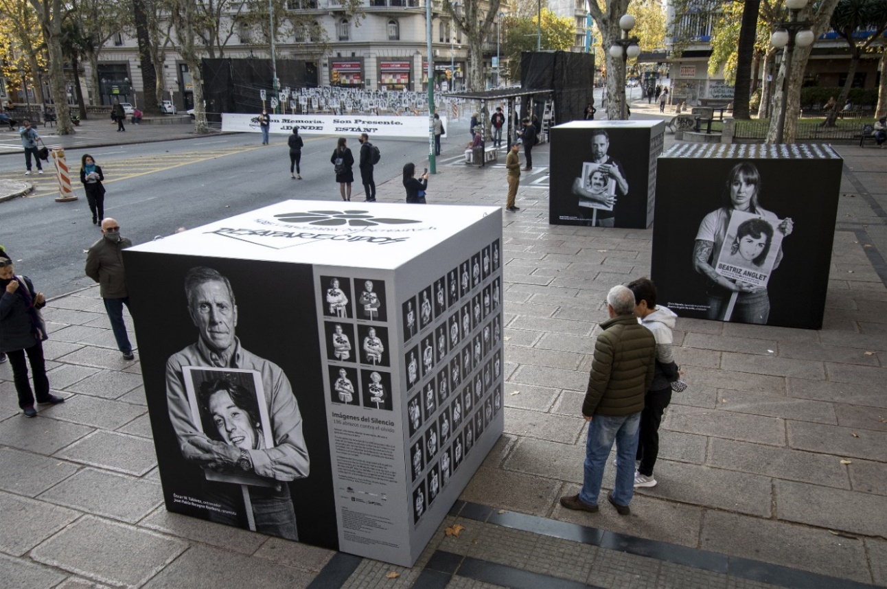 Esto les hace pensar que la marcha “no tiene que nunca más ser como era”, que será necesario dejar que fluyan libremente las propuestas, y que cada uno pueda expresarse de acuerdo a como lo sienta, es decir, “marchando” a su modo. Además, según la misma entrevistada, en 2020 todos los medios de comunicación televisivos y radiales hicieron extensos programas sobre las marchas, el terrorismo de Estado, e infinidad de perspectivas y análisis sobre hechos de la dictadura, lo que en la opinión de Zaffaroni indica que “si se preocuparon en hacer programas es porque la gente estaba en eso, si no, no lo hubieron hecho, fue espectacular” (2020, información verbal). El siguiente registro (FIGURA 2) da cuenta de lo sucedido el 20 de mayo pasado: en el fondo la consigna de ese año y los carteles con las fotografías de los desaparecidos sin sus portadores; adelante, los cubos con las fotografías de “Imágenes del Silencio”, en las cuales se observan algunos referentes abrazando un retrato de un desaparecido.