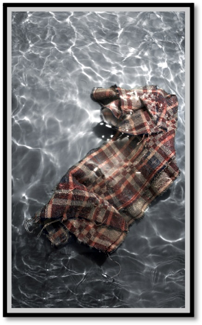 En Río Abajo vemos imágenes, pero, ¿qué vemos en esas imágenes? Vemos fotografías de elementos de uso cotidiano para vestir –cubrir el cuerpo– flotando en agua (FIGURAS 8, 9 e 10). Vemos ropa, gafas, maletas, zapatos, gorras, cobijas. Lo que se está mostrando son fragmentos de la vida cotidiana focalizados desde un primer lugar de enunciación, poniendo en tensión la narración del mundo histórico y del mundo de la vida: las gafas para ver bien, la gabardina para la lluvia, la cartera de la mujer, los zapatos del hombre o el vestido de la niña, a través de los cuales se instaura una reflexión sobre esas prendas, a partir de la contradicción misma entre la fotografía –de prendas de una persona que existe– y la historia –de una persona que no existe más que en el lenguaje[11], en el recuerdo[12], de forma tangencial[13].