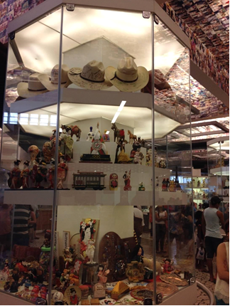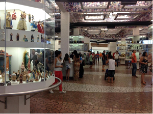 Las personas “miran” los exvotos de otres y son “vistas” también: se exhiben presentando los propios objetos firmados con sus nombres, contando sus historias. En ese sentido, nuevamente hay una semejanza con el museo como complejo expositivo, retomando a Bennett (2005): la persona que visita la sala también se hace ver como “creyente y practicante”, realiza una acción que remeda muchas otras realizadas protocolarmente para generar la eficacia del pacto entre creyente y Virgen María: el pedido del favor, la promesa y su cumplimiento en un espacio colectivo y visible: socialmente compartido. Esa acción reiterada de llevar exvotos y visitar el santuario demuestra la creencia en lo sobrenatural y produce (y reproduce) practicantes a través de su eficacia performativa. Nada de esto se escapa de la organización curatorial del espacio, pues todo está montado para favorecer el mecanismo del dispositivo: microbuses que traen feligreses y turistas, comercios que ofrecen exvotos listos para entregar (Imagen 13), cajero electrónico disponible, cafetería en el complejo, sillas de descanso, escritorio para recepción de ofrendas, circuitos señalizados, cartelas, vitrinas bien iluminadas, máquinas de venta de souvenirs, etc.