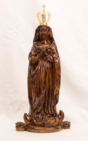 La devoción se remonta al año 1717, cuando unos pescadores de la Villa de Guaratinguetá (que estaba dentro de la Capitanía de São Paulo e Minas de Ouro[3]) arrojaron sus redes y sacaron del río una imagen rota de la Inmaculada Concepción, que luego fue ensamblada. Era una imagen de arcilla, probablemente policromada en blanco, rosa, azul y rojo, que perdió sus colores al estar sumergida en las aguas del río y que, probablemente, se fue oscureciendo aún más con el humo de las velas (Imagen 2). Desde hace algunas décadas, la historiografía viene pensando el papel de Aparecida en la consolidación de la nación brasileña. Así, por ejemplo, se la ha interpretado como la “madre negra de un pueblo mestizo” o la “madre mestiza de una nación” (Souza, 2001, 2017) y como símbolo popular capaz de amalgamar a la sociedad en torno de un proyecto donde la Iglesia brasileña convergiera con el poder del Estado en la construcción de una alianza (no exenta de competencias) donde patria y catolicismo eran indisociables (Souza, 2017).