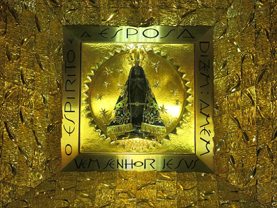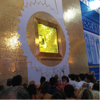 Durante la segunda mitad del siglo XX se levantó y afianzó el enorme conjunto edilicio conocido como la Basílica Nueva (Peters, 2015). El papa la visita en 1980 y, en 1983, la Conferência Nacional dos Bispos do Brasil (CNBB) declaró oficialmente a la Basílica de Aparecida como Santuario Nacional. La Sala das Promessas adquirió su aspecto actual en el año 2003. El santuario sigue bajo la administración de los Misioneros Redentoristas, quienes, desde 1894, son los responsables de la atención a los romeros y peregrinos que llegan del interior de Brasil y del exterior. La fecha central conmemorativa de este santuario es el día 12 de octubre, cuando Brasil celebra a Nuestra Señora Aparecida y se congregan enormes contingentes provenientes de todos los rincones del país para visitar el Santuario Nacional y la pequeña imagen de la Virgen (Imagen 3), conformando un escenario impresionante de expresiones de religiosidad popular (Imagen 4), donde el habitual flujo de agradecimientos y homenajes a la Virgen Aparecida mediante diversos exvotos (fotos, cartas, piezas de cera, dibujos, objetos muy diversos) nos provee de un testimonio riquísimo de las creencias y prácticas de los devotos.