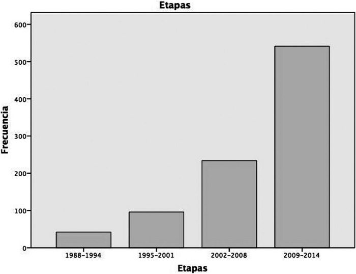 La Figura 1 muestra la evolución del número de artículos publicados en colaboración en revistas de la base de datos WOS entre 1988 y 2014, inclusive. Como se puede apreciar, la tendencia evidencia un incremento exponencial (y= 17,69 e0,85x). Este incremento puede estar relacionado con las exigencias de las instituciones de financiamiento y evaluación del desempeño académico en los últimos años. Actualmente se percibe un incremento en las exigencias a los académicos para publicar artículos en revistas de corriente principal, lo cual se refleja en su evaluación del desempeño, remuneración o la jerarquía académica.