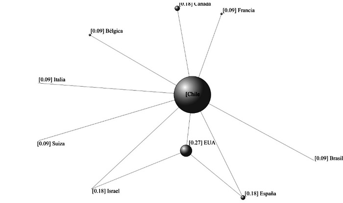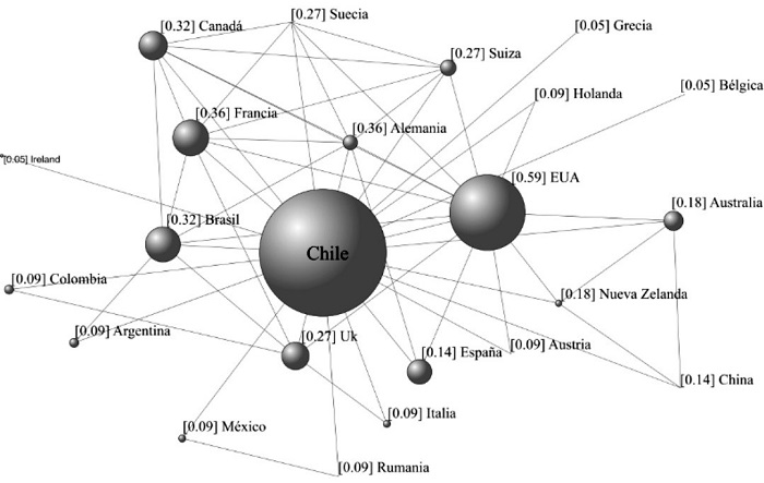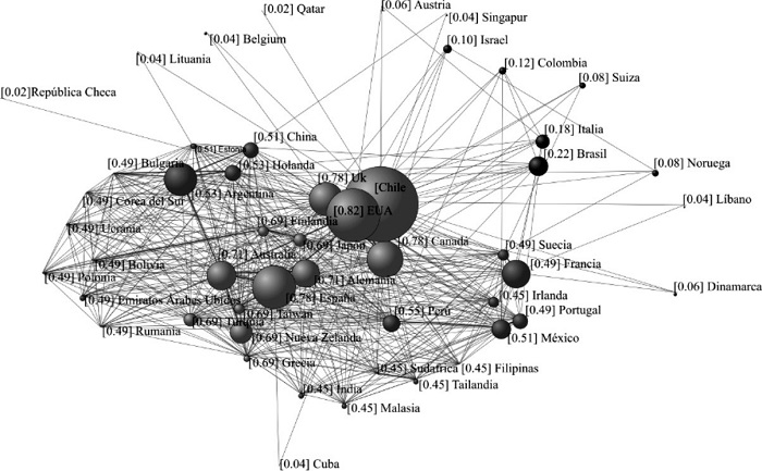 Segundo. Se creó una matriz modo dos. Para ello se analizó cada artículo con más de un autor. Se colocó en las columnas el país con el que colaboró Chile en el artículo. Luego se normalizó la matriz mediante el coseno de Salton (Salton y McGill, 1983). La matriz cuadrática resultante se utilizó como entrada para mapear la estructura de la red de colaboración internacional mediante el empleo del programa Pajek (Batagelj y Mrvar, 1998). Para establecer la relevancia de los países en la estructura de la red de colaboración se utilizó el valor del grado de centralidad de cada país (Freeman, 1977).